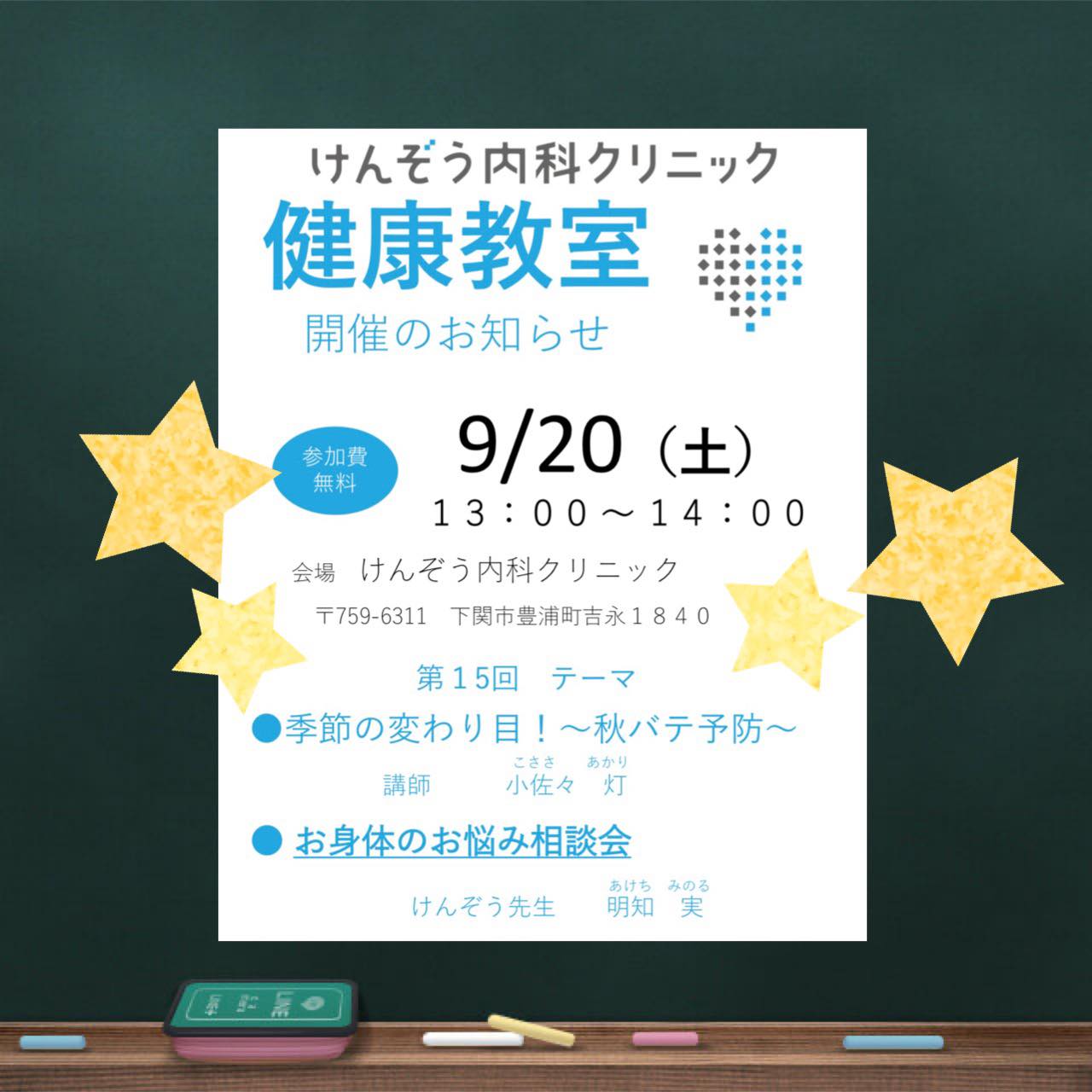 来月の健康教室のお知らせです! 9/20(土)いつもの第3土曜日13時より 開催致します!