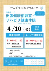 4月10日(金)9時より「ゆめマート出張健康相談室」、11時より「リハビリ健康体操」を開催いたします。